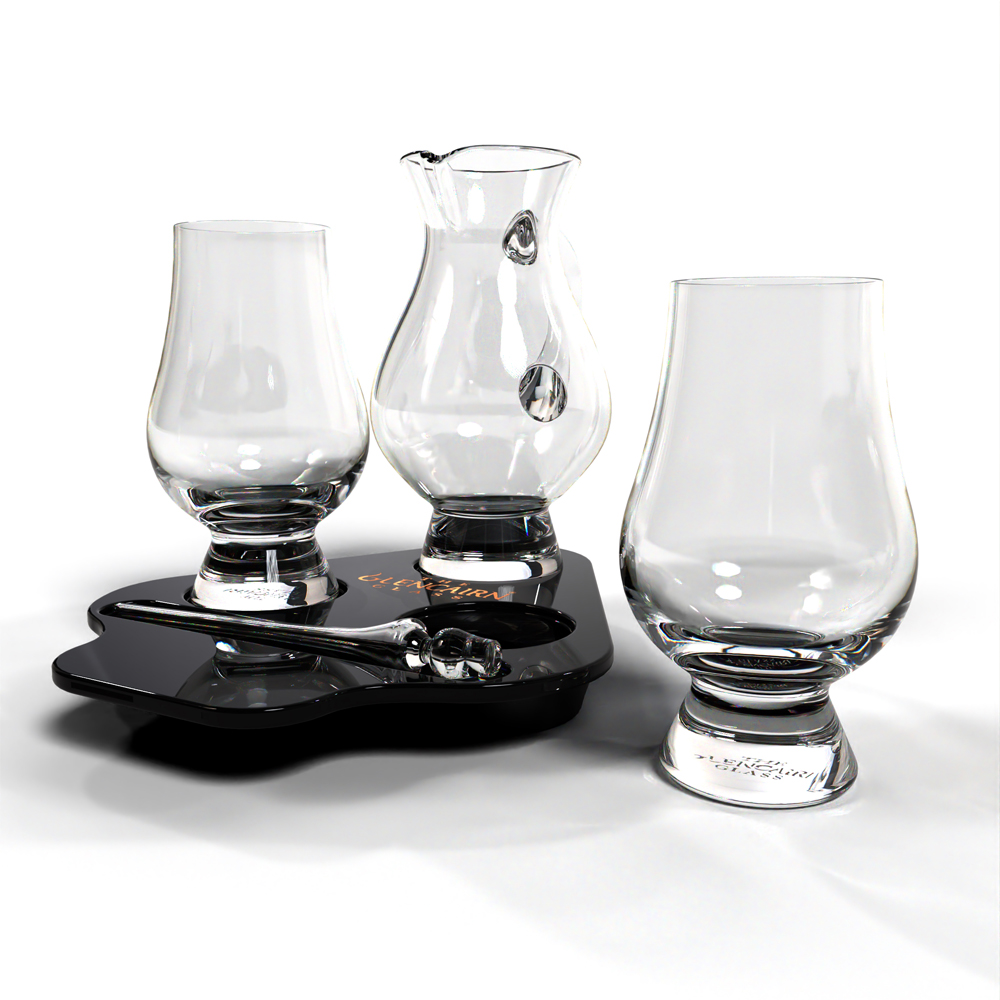 Sættet indeholder to klassiske Glencairn-glas, der er blevet kåret som det officielle whiskyglas og har modtaget The Queens Award for Innovation i Storbritannien, en pipette, en Glencairn-vandkande i blyfri krystal og en bakke i poleret og lakeret træ.